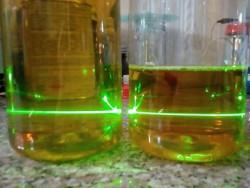 世間一般的に広まっている作り方では、レーザービームを当ててコロイドを確認し、レーザーが強く見えた方が良いコロイダルシルバーだと言われていますが、実は本当はレーザーが弱く見えるほど良いです。懐中電灯の場合は、色っぽく濁って見えるのが少ないほど良いコロイダルシルバーです。チンダル現象はコロイド粒子があることを示していますが、チンダル現象は弱いほど良いです。一般に広まっている作り方で作られ、レーザーを当てて見えるのはコロイド粒子ではなく、コロイド状の酸化銀結晶です。これは銀を過度に加熱することによって引き起こされています。